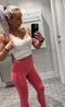 Red leopard leggings. Good and comfortable to wear. Slips down a little but not much. The color is red and not pink unfortunately. Otherwise very good and comfortable.